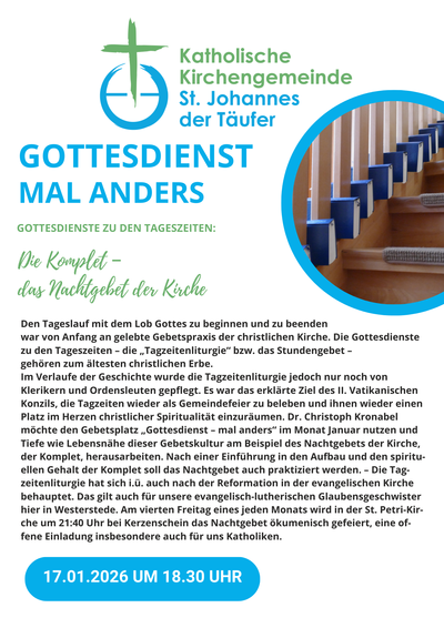 Schön, dass Sie den Weg zu uns gefunden haben, hier auf den Internetauftritt unserer Pfarrgemeinde St. Johannes d. Täufer mit den Gemeindeteilen Westerstede und Augustfehn. Wir möchten Sie auf den folgenden Seiten einladen zu einem Rundgang durch unser vielfältiges Gemeindeleben.