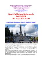 Lourdes-Wallfahrt 2020: Für alle, die langfristig planen, teilen wir mit, dass Diakon Norbert Zwingmann für nächstes Jahr in der Zeit von Samstag, 16. Mai bis Samstag 23. Mai 2020 eine Bus-Lourdes-Wallfahrt organisieren wird.