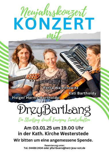 Zu einem Neujahrskonzert mit dem Folktrio DreyBartLang lädt die katholische Kirchengemeinde St. Johannes der Täufer am 3. Januar 2025 um 19 Uhr in die Herz-Jesu Kirche in Westerstede ein. Seit eineinhalb Jahrzehnten durchstreifen Petra Walentowitz, Kati Bartholdy und Holger Harms-Bartholdy als Folktrio DreyBartLang mit Akkordeon, Geige und Gitarre die musikalischen Landschaften Europas. Sie reisen entlang der felsigen Küsten Nordeuropas und machen Halt an der französischen Atlantikküste wie auch am schwarzen Meer. Sie tauchen ein in die äußerst lebendige skandinavische Volksmusik, die vertrackten Taktarten Osteuropas und in die Musik vieler anderer Länder und verarbeiten ihre intensive Verbindung zur Nordseeküste in stimmungsvollen eigenen Kompositionen. Die Musik fließt, reinigt und erfrischt wie das Urelement Wasser. Mit seinem konzertanten Kammerfolk hat sich das Trio in der Region einen sehr guten Ruf erworben und wurde von der Oldenburgischen Landschaft für seine vielfältigen musikalischen Aktivitäten, so z.B. für seinen Nordischen Zugfolk der Zugvogeltage, mit einem Förderpreis ausgezeichnet. Reservierungen für das Konzert werden unter Telefon 04488/2434 oder unter pfarrbuero@herz-jesu-wst.de entgegengenommen. Der Eintritt ist frei - um eine angemessene Spende wird gebeten.
